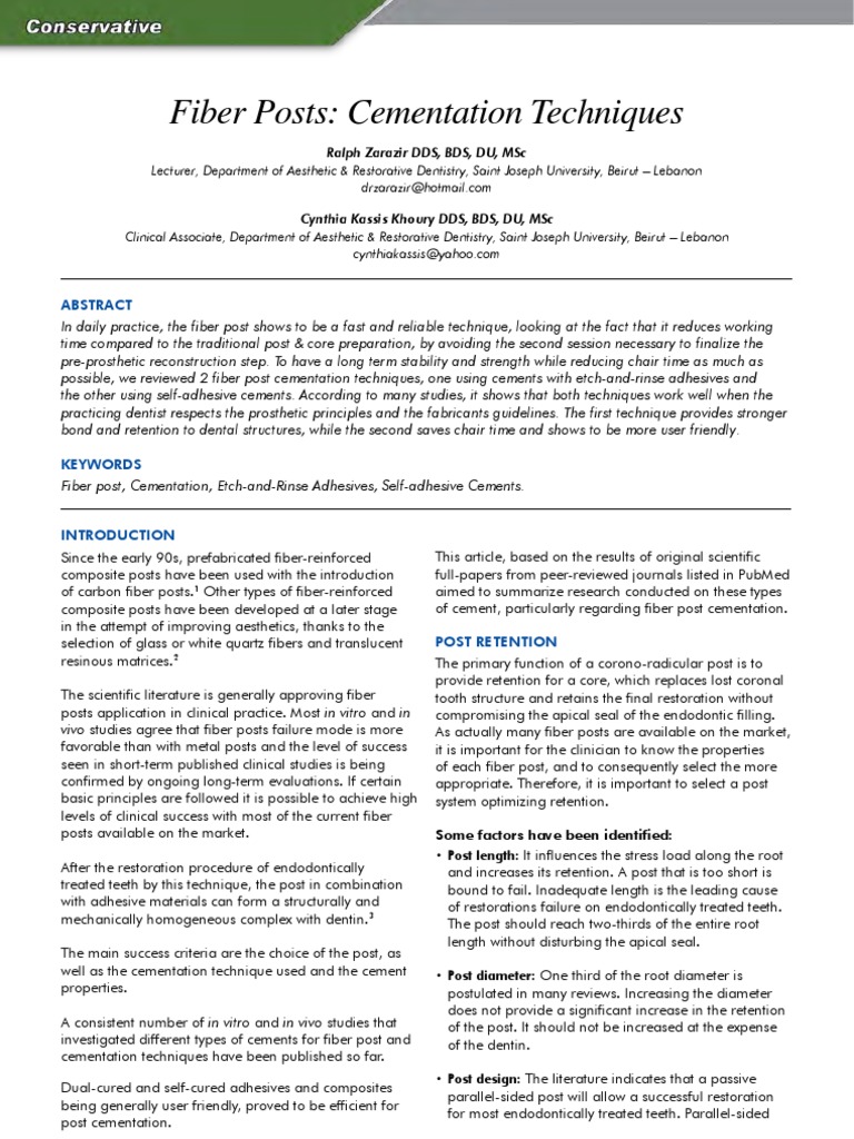 Cementation Of Fiber Post : Cementation of post-and-core. | Download Scientific Diagram - A post and core crown is a type of dental restoration required where there is an inadequate amount of sound tooth tissue remaining to retain a conventional crown.. 63 found that with the inclusion of fibers into the soil, the unconfined compressive strength and the corresponding strain at failure increase up to an optimum fiber. A post is cemented into a prepared root canal, which retains a core restoration, which retains the final crown. Endodontic post crown bridge restoration on abutment inlay onlay veneer, tabletop maryland and inlay/onlay bridge 1 priming not required for 3m™ relyx™ fiber posts | 2 alternative primer: Dec 16, 2017 · the increment in fiber content and length of fiber caused increment in optimum moisture content (omc) and slight decrement of maximum dry density (mdd). Aug 22, 2013 · relyx™ fiber post technique guide (pdf, 465.8kb) 3m™ relyx™ fiber post cementing endodontic post (pdf, 935.0kb) cementation guide for glass ceramics made with chairside cad/cam systems (pdf, 847.5kb)
